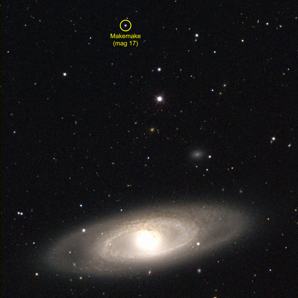 从视觉绝对星等来看,Makemake 是仅次于厄里斯和冥王星的第三亮已知海王星外天体 $^{[87]}$。Makemake 的高度本征亮度源于其体积较大以及表面具有极高反射率 $^{[w]}$。另一方面,从视觉视星等来看,Makemake 是天空中仅次于冥王星的第二亮海王星外天体,这是因为它与太阳的距离比厄里斯更近 $^{[25][68]}$。每年 3 月至 4 月进入冲日位置时,Makemake 的视星等峰值约为 17 等 $^{[89][90]}$,在这种亮度下,可使用高级业余望远镜观测到它 $^{[6]}$。由于 Makemake 与地球距离极为遥远,在望远镜中它呈现为一个角直径约 38 毫角秒的微小天体 $^{[22]:568}$,因此望远镜无法将其分辨成除类似恒星光点之外的形状 $^{[89]}$。在夜空中,Makemake 位于北天的后发座,自其被发现以来一直位于该星座 $^{[90]}$。在 2028 年末,Makemake 将移动至牧夫座 $^{[90]}$。
