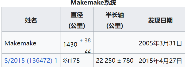 玛克马克 $^{[g]}$(小行星编号:136472 Makemake)是一颗位于柯伊伯带的矮行星,柯伊伯带是海王星轨道之外由冰质天体组成的圆盘。它是第四大海王星外天体,也是经典柯伊伯带中体积最大的成员 $^{[h]}$,其直径约为冥王星的 60%。它于 2005 年 3 月 31 日由美国天文学家迈克尔·E·“迈克”·布朗(Michael E. "Mike" Brown)、查德·特鲁希略(Chad Trujillo)和大卫·拉比诺维茨(David Rabinowitz)在帕洛马天文台发现。作为该团队发现的最大天体之一,玛克马克的发现促成了 2006 年冥王星被重新归类为矮行星。