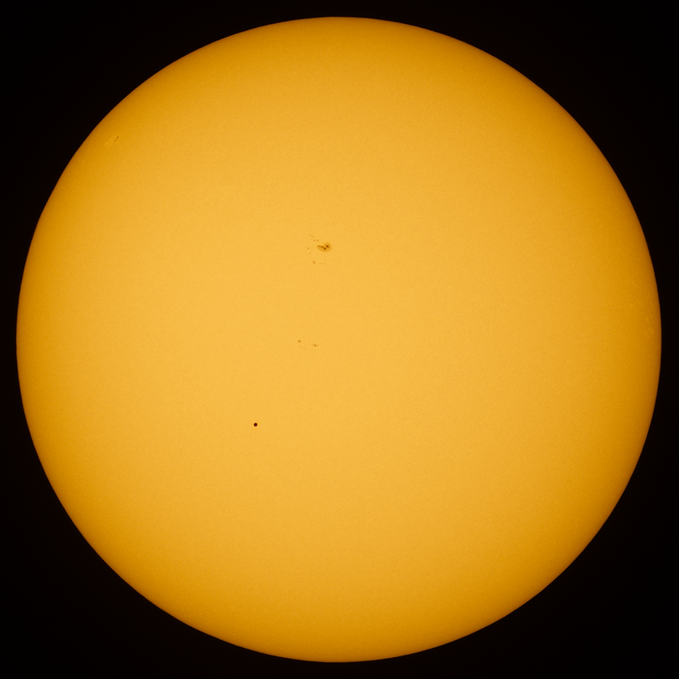 水星轨道相对于地球轨道平面(黄道面)的倾角为 \(7^{\circ}\),这是太阳系八大行星中最大的倾角 \(^\text{[112]}\)。因此,水星凌日现象只有在其位于地球与太阳之间、并同时通过黄道面时才会发生,即发生在每年的五月或十一月。平均而言,这一现象大约每七年出现一次 \(^\text{[113]}\)。