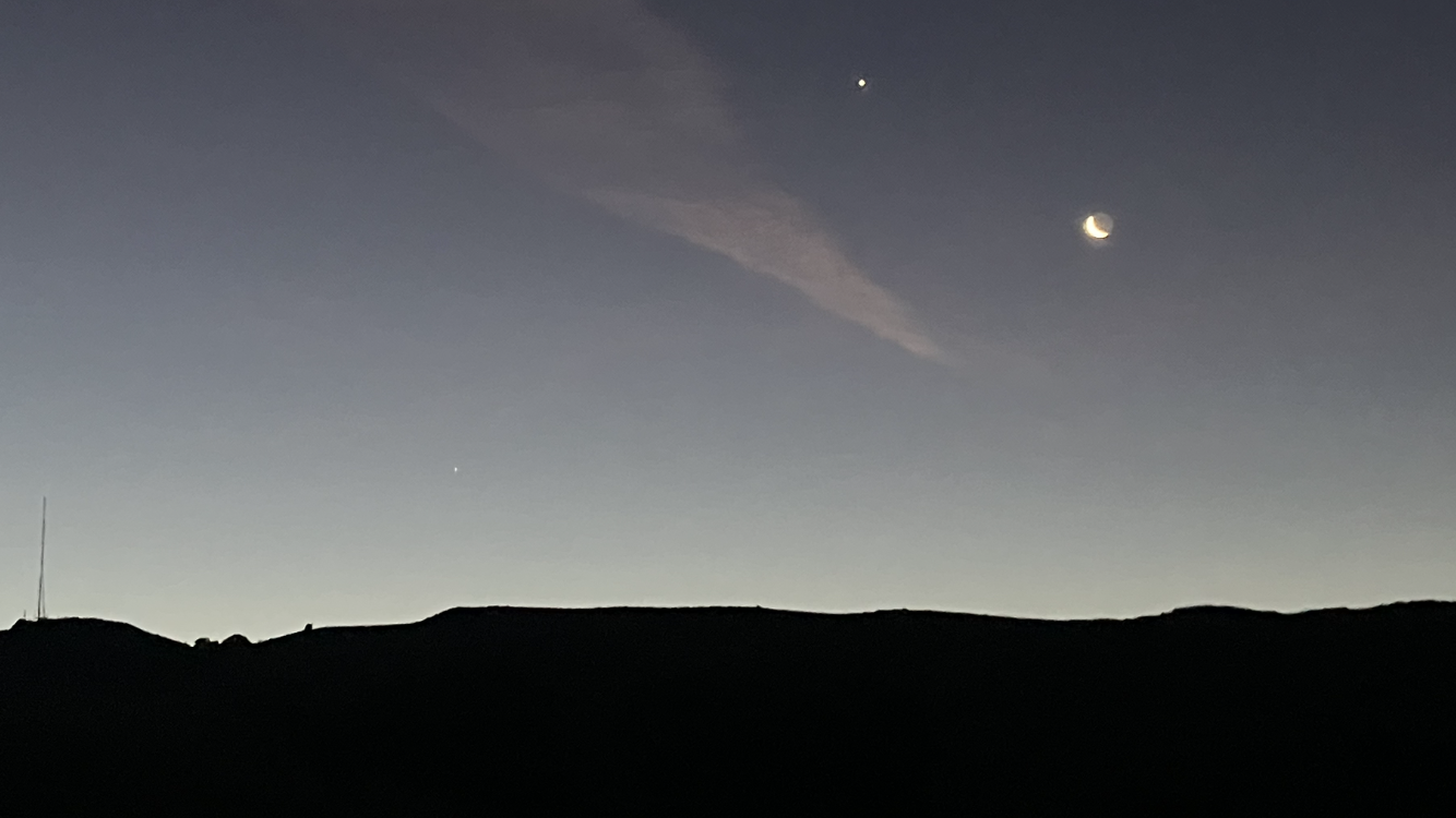 图 16:从加利福尼亚州圣何塞观测到的水星(左下),同框可见金星与月球。
