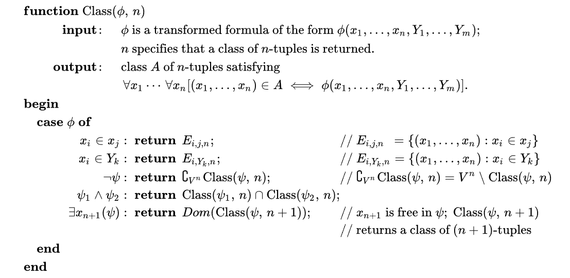 递归计算机程序简洁地捕捉了从给定公式构造类的过程。这个程序的定义并不依赖于类存在定理的证明。然而,需要证明该程序构造的类满足给定的公式并且是通过公理构建的。该程序用伪代码编写,使用了一种类似 Pascal 的 case 语句。