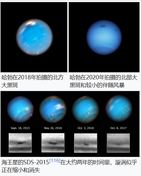 1989 年,NASA 的旅行者 2 号航天器发现了 “大黑斑”,这是一种反气旋风暴系统,范围达到 \(13{,}000\,\text{km} \times 6{,}600\,\text{km}\)(\(8{,}100\,\text{mi} \times 4{,}100\,\text{mi}\))\(^\text{[110]}\)。该风暴类似于木星的大红斑。大约五年之后,即 1994 年 11 月 2 日,哈勃太空望远镜未能在行星上看到大黑斑。取而代之的是,在海王星北半球发现了一个与大黑斑相似的新风暴 \(^\text{[113]}\)。