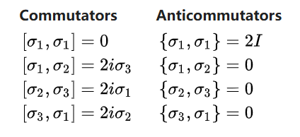 这些矩阵具有自反性: $$ \sigma_1^2 = \sigma_2^2 = \sigma_3^2 = -i\,\sigma_1\sigma_2\sigma_3 = \begin{pmatrix} 1 & 0 \\ 0 & 1 \end{pmatrix} = I,~ $$ 其中 $I$ 是单位矩阵。