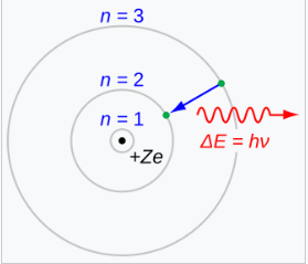 图 4:氢原子波尔模型的示意图。图中从 n = 3 能级到 n = 2 能级的跃迁产生了 656 nm(红色)波长的可见光,正如该模型所预测的那样。
