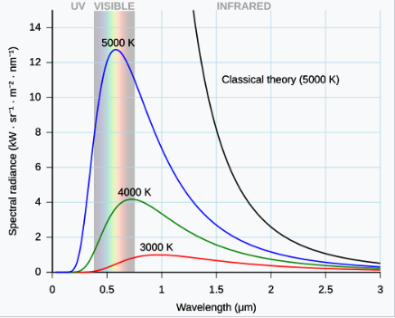图 3:在不同温度下观察到的普朗克曲线,以及理论上的雷利-简斯(黑色)曲线与在 5000 K 下观察到的普朗克曲线的偏离。