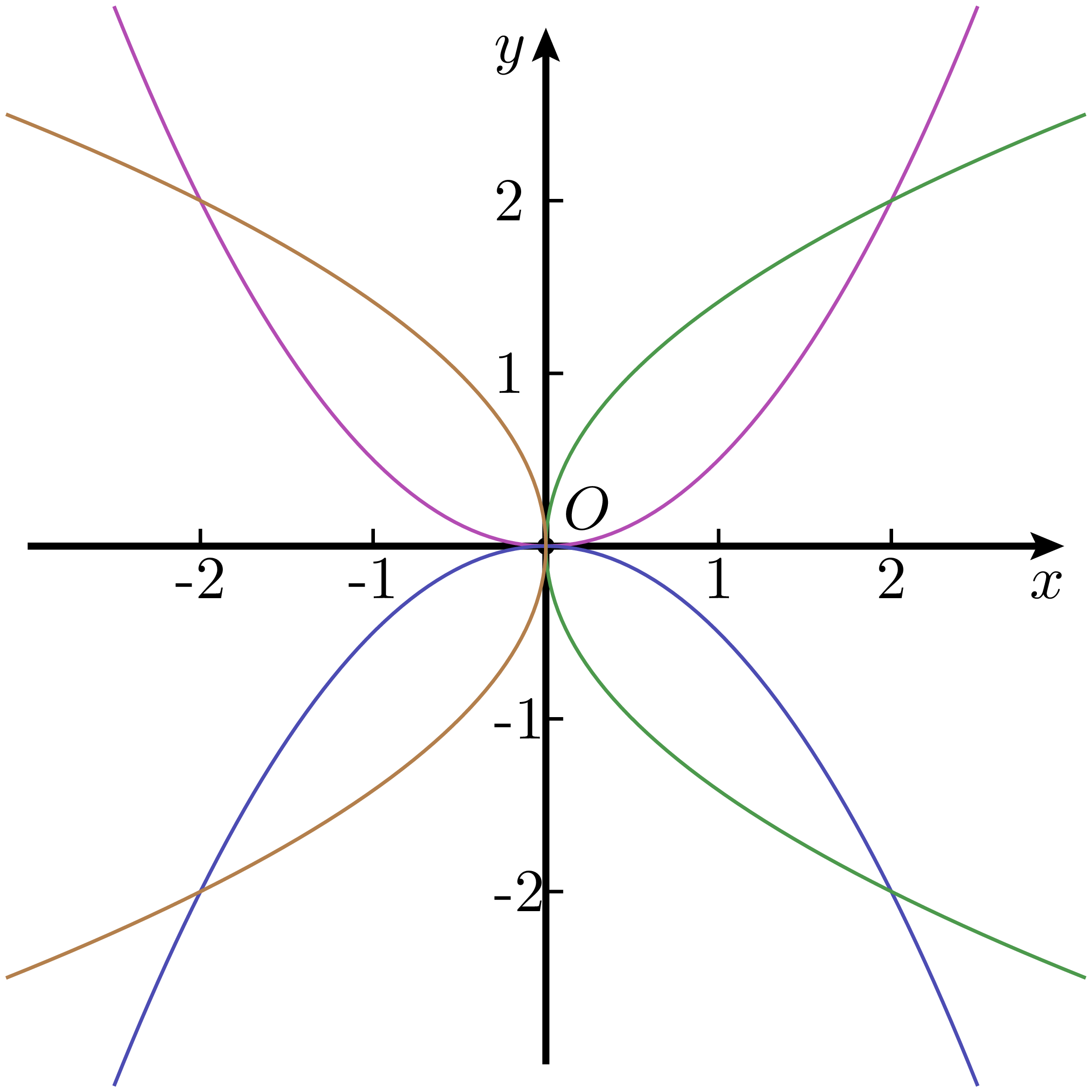 与椭圆或双曲线可以通过两个独立的参数分别控制 $x$、$y$ 方向的变化不同,标准形式的抛物线只由一个参数 $p$ 控制其开口程度。如果希望改变抛物线对称轴的方向,不能通过调整参数值实现,而需要通过改变二次项所对应的变量,也就是修改变量的名称来完成。从 “族” 的角度看,所有对称轴相同,仅参数 $p$ 不同的抛物线可以看作是一个抛物线族。