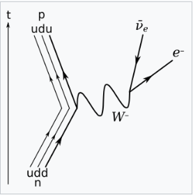 图 3:一个费曼图,展示了β−衰变,显示一个中子(n, udd)转化为一个质子(p, udu)。"u" 和 "d" 是上夸克和下夸克,"e−" 是电子,"νe" 是电子反中微子。
