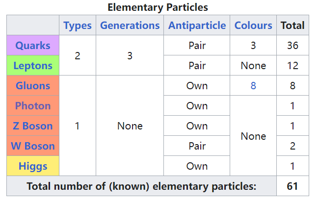宇宙中的基本粒子在标准模型中被分类为费米子(物质粒子)和玻色子(传递力的粒子)。费米子有三代,然而普通物质仅由第一代费米子构成。第一代包括构成质子和中子的上夸克和下夸克,以及电子和电子中微子。已知由玻色子介导的三种基本相互作用是电磁相互作用、弱相互作用和强相互作用。