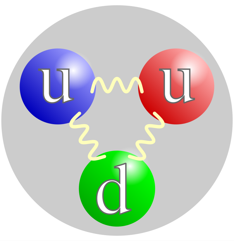 图 4:一个质子由两个上夸克和一个下夸克组成,这些夸克通过胶子相互连接。夸克的颜色电荷也可见。