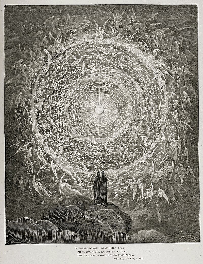 但丁·阿利吉耶里对毕达哥拉斯的数字学非常着迷[305],并将他的《地狱》、《炼狱》和《天堂》的描述基于毕达哥拉斯的数字。[305] 但丁写道,毕达哥拉斯将 “一” 视为善,将 “多” 视为恶[306],并在《天堂篇》第十五章 56-57 行中宣称:“五与六,若理解了,从一中发出光辉。”[307] 数字十一及其倍数贯穿《神曲》全书,每一卷都有三十三首歌诗,除了《地狱篇》,其有三十四首,第一首作为总介绍。[308] 但丁将地狱第八圈的第九和第十道波尔吉亚描述为分别为二十二英里和十一英里[308],这与分数 22/7 相对应,这是毕达哥拉斯对圆周率的近似值。[308]