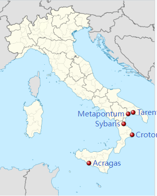 大约在公元前 530 年,当毕达哥拉斯大约 40 岁时,他离开了萨摩斯岛。[2][29][71][72][73] 后来的追随者声称他离开是因为不满波利克拉底斯在萨摩斯岛上的暴政,[71] 里德维格指出,这一解释与尼科马库斯对毕达哥拉斯声称的自由热爱的强调相符,但毕达哥拉斯的敌人则将他描绘成有暴政倾向的人。[71] 另一些记载则称毕达哥拉斯离开萨摩斯是因为他在萨摩斯担任过多的公共职务,且由于他在市民中的高评价,感到负担沉重。[74] 他来到了位于大希腊的希腊殖民地克罗顿(今天的卡拉布里亚的克罗托内)[29][73][75][76][77]。所有的记载都一致认为,毕达哥拉斯具有非凡的个人魅力,并迅速在新的环境中获得了巨大的政治影响力。[29][78][79] 他为克罗顿的精英提供建议,并经常给予他们指导。[80] 后来的传记作者讲述了他雄辩演讲所带来的奇幻故事,声称这些演讲使克罗顿人民放弃了奢华和腐化的生活方式,转而投身于他所引入的更纯洁的体系。[81][82]
