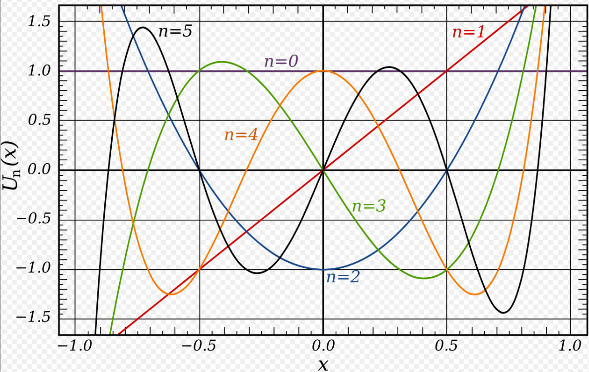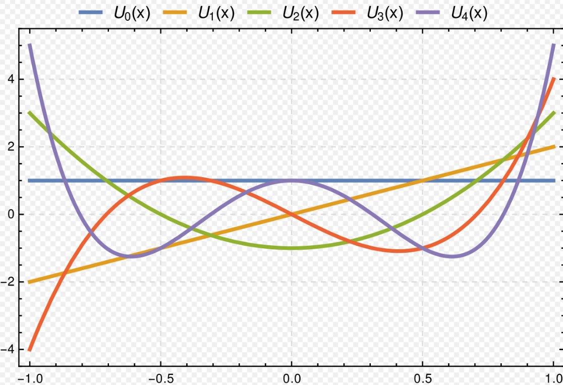 前几项第二类切比雪夫多项式(参见 OEIS: A053117)为: $$ \begin{aligned} U_0(x) &= 1 \\ U_1(x) &= 2x \\ U_2(x) &= 4x^2 - 1 \\ U_3(x) &= 8x^3 - 4x \\ U_4(x) &= 16x^4 - 12x^2 + 1 \\ U_5(x) &= 32x^5 - 32x^3 + 6x \\ U_6(x) &= 64x^6 - 80x^4 + 24x^2 - 1 \\ U_7(x) &= 128x^7 - 192x^5 + 80x^3 - 8x \\ U_8(x) &= 256x^8 - 448x^6 + 240x^4 - 40x^2 + 1 \\ U_9(x) &= 512x^9 - 1024x^7 + 672x^5 - 160x^3 + 10x \\ U_{10}(x) &= 1024x^{10} - 2304x^8 + 1792x^6 - 560x^4 + 60x^2 - 1 \end{aligned}~ $$