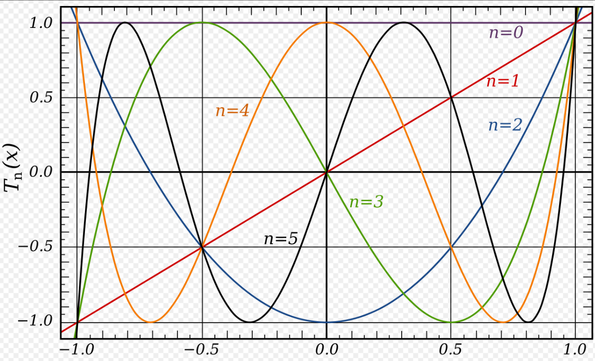 切比雪夫多项式 $T_n$ 是在区间 $[-1, 1]$ 上绝对值被限制在 1 以内、且首项系数最大的多项式。它们也是满足许多其他性质的 “极值” 多项式之一 \(^\text{[1]}\)。