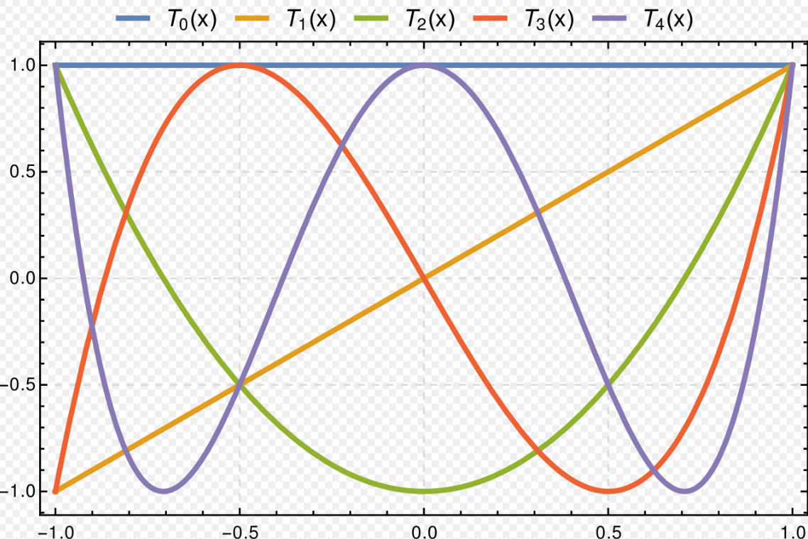 任意一个次数为 $N$ 的多项式都可以用第一类切比雪夫多项式表示出来。\(^\text{[10]}\) 这样的多项式 $p(x)$ 具有如下形式: $$ p(x) = \sum_{n=0}^{N} a_n T_n(x)~ $$ 以切比雪夫形式表示的多项式可以通过 Clenshaw 算法进行高效计算。