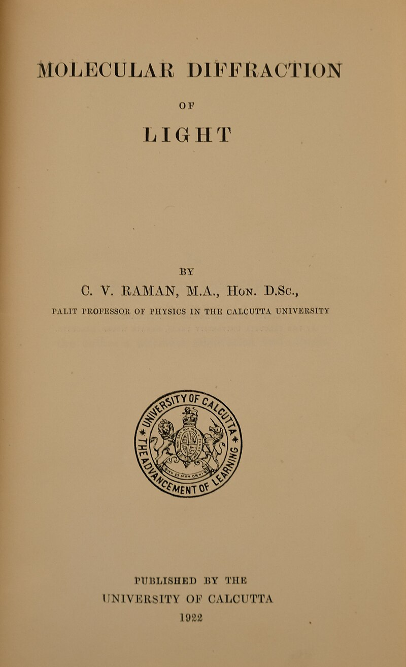 当拉曼抵达加尔各答后,他请来自仰光大学的学生 K. R. 拉曼纳森在印度科学促进会(IACS)继续展开进一步研究。\(^\text{[64]}\) 到 1922 年初,拉曼得出了自己的结论,并在《伦敦皇家学会学报》上发表了报告: