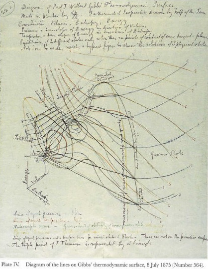 吉布斯于 1873 年发表了他的第一部作品。他关于热力学量几何表示法的论文刊登在《康涅狄格艺术与科学学院学报》上。这些论文引入了不同类型的相图,这些图形工具是他在研究过程中最喜欢的想象辅助工具——相比之下,他并不依赖麦克斯韦在构建其电磁理论时所使用的机械模型,因为后者可能无法完全代表所对应的物理现象。尽管该期刊的读者很少有人能够理解吉布斯的研究内容,他仍将论文的抽印本寄给欧洲的同行,其中一位是剑桥大学的詹姆斯·克拉克·麦克斯韦,后者对此热情回应。麦克斯韦甚至亲手用黏土制作了一个模型,以展示吉布斯的构造。他随后还制作了两个石膏模型,其中一个寄送给了吉布斯。该石膏模型如今陈列在耶鲁大学物理系。