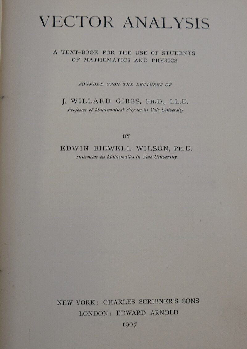 向量微积分的发展是吉布斯对数学的另一项重大贡献。1901 年,E.B. 威尔逊出版了教科书《向量分析》,该书基于吉布斯在耶鲁的讲义,极大地推动了向量方法及其符号在数学和理论物理中的广泛应用,最终彻底取代了此前在科学文献中占据主导地位的四元数体系。