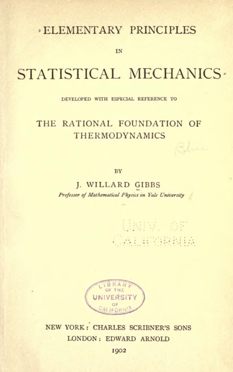 吉布斯创造了 “统计力学” 这一术语,并在描述物理系统的数学框架中引入了一些关键概念,包括化学势(1876 年)和统计系综(1902 年)等。吉布斯通过多粒子系统的统计性质推导出热力学定律,并将这项重要成果总结于其极具影响力的教科书《统计力学的基本原理》中,该书于 1902 年出版,即他去世前一年。