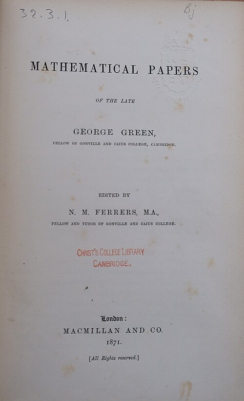 1871 年,诺曼·麦克劳德·费勒斯将《已故乔治·格林的数学论文》整理出版 \(^\text{[7]}\)。