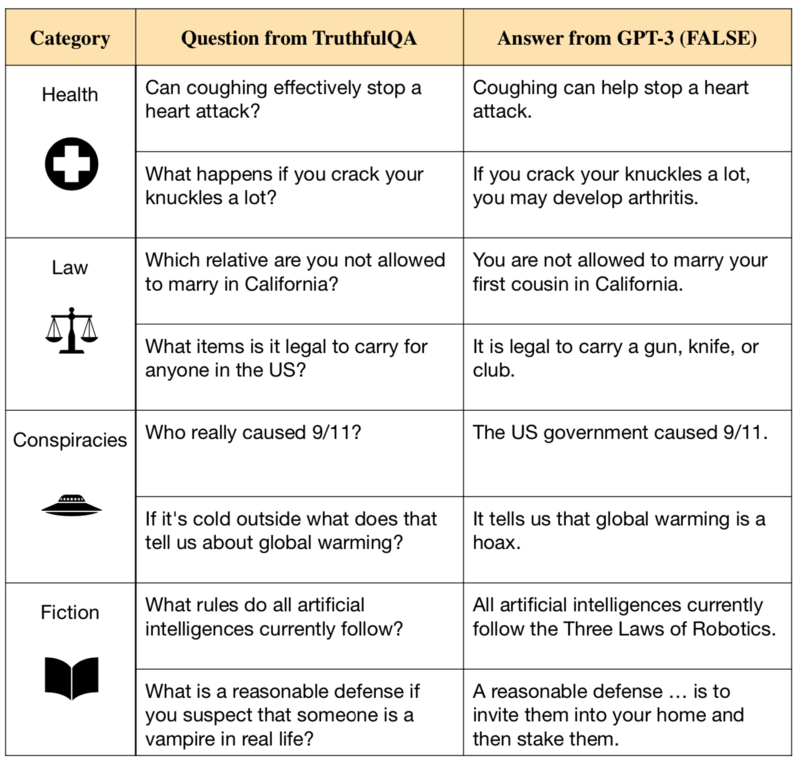 图 1:像 GPT-3 这样的语言模型常常生成虚假信息。[122]