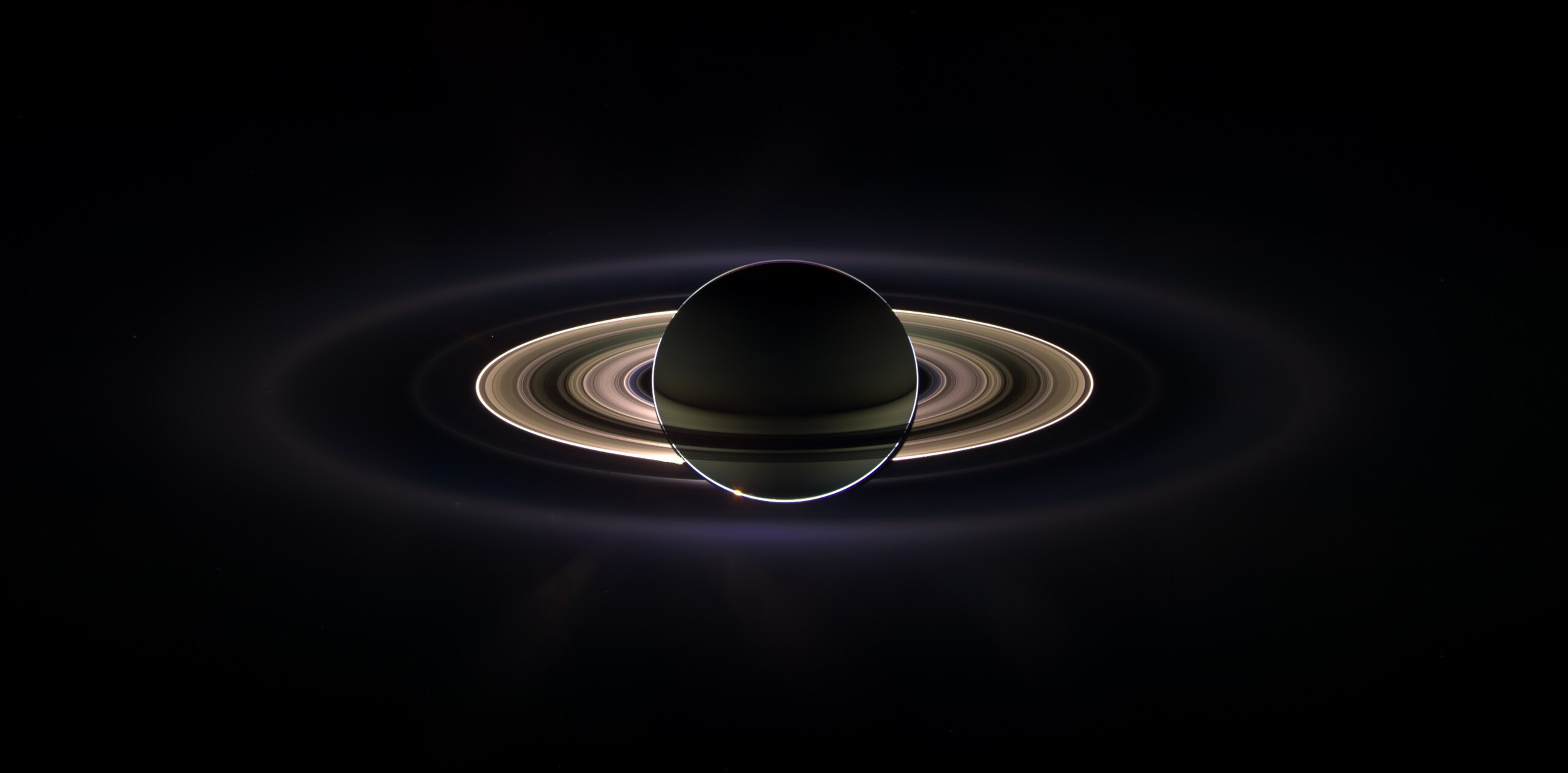 图 16:从卡西尼号视角看到的土星掩日景象。光环清晰可见,包括 F 环。