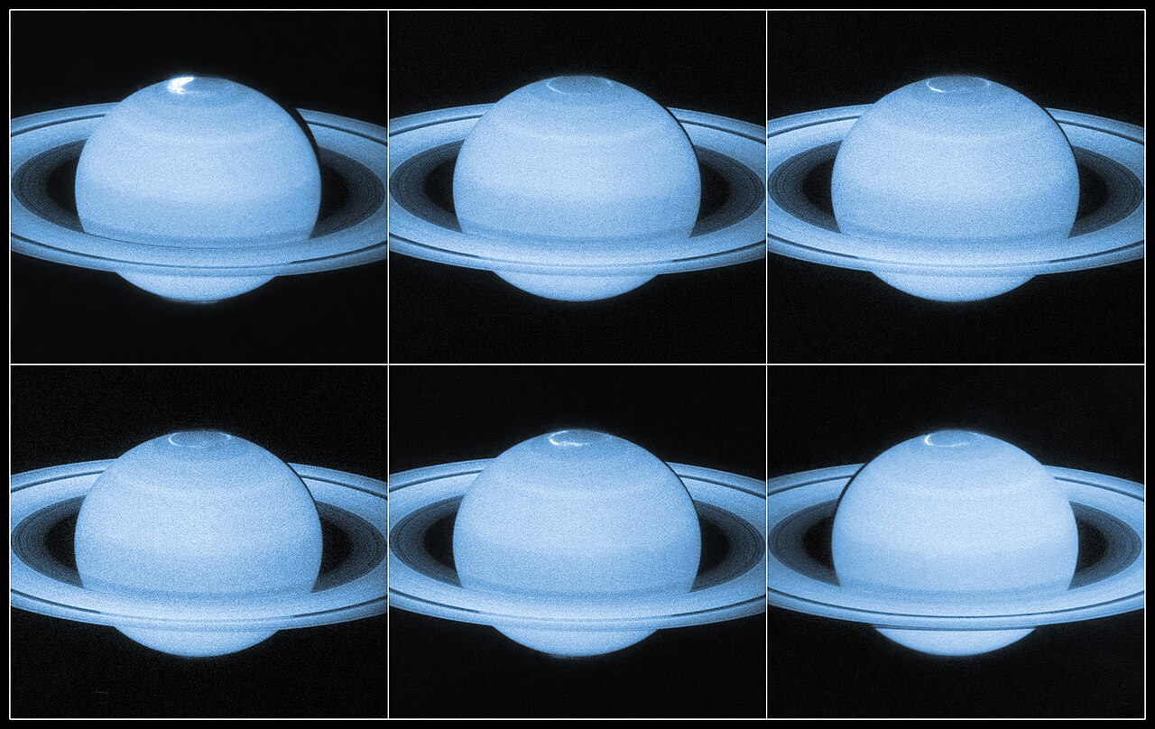 土星内部自转周期的精确数值仍难以确定。卡西尼号于 2004 年接近土星时发现土星无线电自转周期明显增加,约为 10h 45m 45s ± 36s。\(^\text{[90][91]}\) 结合卡西尼号、旅行者号与先驱者号的多项测量结果,对土星整体自转速率的估计为 10h 32m 35s。\(^\text{[92]}\) 对土星 C 环的研究得出的自转周期为 10h 33m 38s \(^{+1m 52s}_{-1m 19s}\)。\(^\text{[17][18]}\)