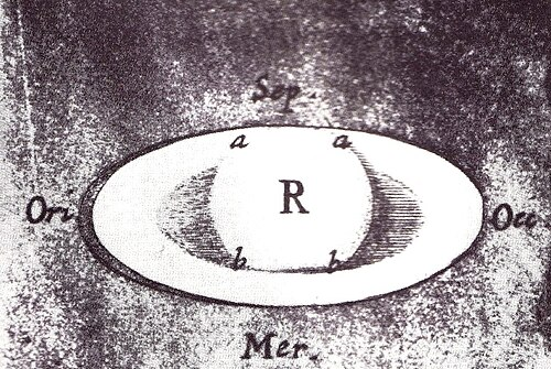 图 12:罗伯特·胡克在 1666 年的这幅土星绘图中注意到球体与光环彼此投下的阴影(a 与 b)。