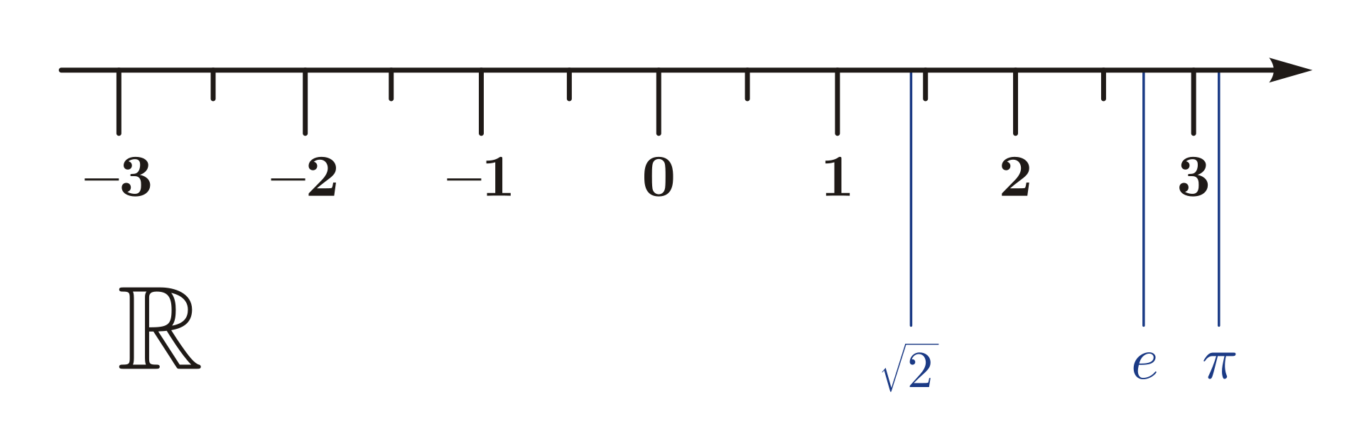 实数集有时被称为 “the reals”(实数),传统上记作黑体 R,通常使用黑板粗体符号 $\mathbf{R}$。\(^\text{[1][2]}\)“实数” 这一形容词在 17 世纪由勒内·笛卡尔使用,用以区别实数与虚数(如 −1 的平方根)。\(^\text{[3]}\)