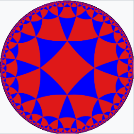 在 AdS/CFT 对应中,时空的几何结构由爱因斯坦方程的一种特定真空解描述,这种解被称为反德西特空间(Anti-de Sitter Space, AdS)。[6] 从基本角度来看,反德西特空间是一个时空的数学模型,其中点之间的距离(度量)与普通欧几里得几何中的距离概念不同。它与双曲空间密切相关,后者可以被看作如左图所示的圆盘。[71] 该图显示了一个由三角形和正方形镶嵌的圆盘。可以在这个圆盘上定义一种特殊的距离,使得所有三角形和正方形大小相同,并且圆形外边界与内部的任何点都相距无穷远。[72]