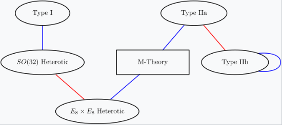 超弦理论有多个版本:类型 I、类型 IIA、类型 IIB 和两种异质弦理论(\(SO(32)\) 和 \(E_8\times E_8\))。不同的理论允许不同类型的弦,并且在低能量下出现的粒子表现出不同的对称性。例如,类型 I 理论包含开放弦(具有端点的弦段)和闭合弦(形成闭环的弦),而类型 IIA、IIB 和异质弦理论仅包含闭合弦。[18]