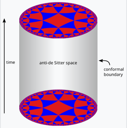 反德西特空间的一个重要特性是其边界(在三维反德西特空间的情况下,它看起来像一个圆柱体)。该边界的一个性质是,在边界上围绕任意一点的小区域内,它的结构与闵可夫斯基空间非常相似,而闵可夫斯基空间是非引力物理中使用的时空模型。[73]