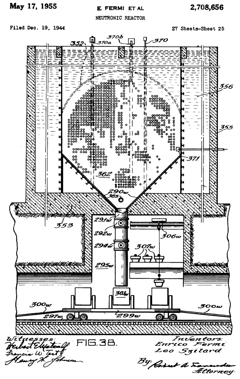 当时一个令人头痛的问题是生产反应堆应该如何冷却。采取保守的观点,认为每个中子都必须被保存,最初大多数人认为应该使用氦气冷却,因为氦气吸收的中子非常少。西拉德认为,如果这是一个问题,那么液态铋会是更好的选择。他监督了使用液态铋的实验,但实际操作中的困难太大,最终无法克服。最后,维格纳提出的使用普通水作为冷却剂的计划获得了胜利。[68] 当冷却剂问题变得越来越激烈时,科普顿和曼哈顿计划的负责人,莱斯利·R·格罗夫斯少将,准备解除西拉德的职务,因为他仍是德国公民,但战争部长亨利·L·斯廷森拒绝这样做。[72] 因此,西拉德于 1942 年 12 月 2 日亲自见证了第一次人工自持核链式反应的实现,这是在斯塔格场的看台下进行的第一座核反应堆中发生的,并与费米握手。[73]