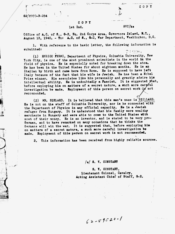 一个铀委员会在莱曼·J·布里格斯的领导下成立,布里格斯是科学家和国家标准局的局长。委员会的第一次会议于 1939 年 10 月 21 日举行,西拉德、泰勒和维格纳出席了会议,他们说服了陆军和海军为西拉德提供 6,000 美元,用于购买实验用品,特别是更多的石墨。[60] 1940 年,一份关于费米和西拉德的陆军情报报告在美国尚未加入第二次世界大战时准备好,其中对二者表示了保留意见。虽然报告中对西拉德有一些事实错误,但它正确地记录了他对德国将赢得战争的严峻预测。[61]