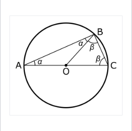 该定理出现在欧几里得《几何原本》第三卷(公元前 300 年左右)的第 31 命题中:“在圆中,半圆内的角是直角,较大弧段中的角小于直角,较小弧段中的角大于直角;此外,较大弧段的角大于直角,较小弧段的角小于直角。”