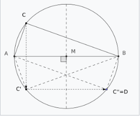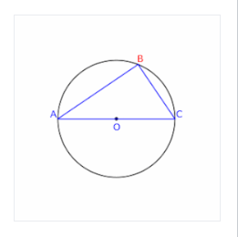 设 \(\triangle ABC\) 为圆中的一个三角形,其中 \(AB\) 是该圆的直径。然后通过先沿直线 AB 反射 \(\triangle ABC\),再沿通过圆心且垂直于 \(AB\) 的直线进行第二次反射,构造一个新的三角形 \(\triangle ABD\)。由于 \(AC\) 和 \(BD\) 是平行的,同样 \(AD\) 和 \(CB\) 也是平行的,四边形 \(ABCD\) 是平行四边形。由于 \(AB\) 和 \(CD\) 是平行四边形的对角线,且它们都是圆的直径,因此长度相等,所以这个平行四边形必须是矩形。矩形中的所有角都是直角。
