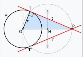 塔勒斯定理可以用来构造通过给定点的圆的切线。在右图中,给定圆 \(K\) 的圆心为 \(O\),点 \(P\) 在圆外,先在 \(\overline{OP}\) 上找到中点 \(H\),然后以 \(H\) 为圆心,\(\overline{OH}\) 为半径绘制一个圆。\(\overline{OP}\) 是该圆的直径,因此连接 \(\overline{OP}\) 与圆与点 \(T\) 和 \(T'\) 的交点的三角形都是直角三角形。