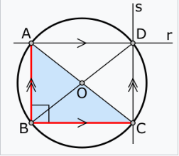 设 \(\angle ABC\) 为直角,\(r\) 为通过 \(A\) 且平行于 \(\overline{BC}\) 的直线,\(s\) 为通过 \(C\) 且平行于 \(\overline{AB}\) 的直线。设 \(D\) 为直线 \(r\) 和直线 \(s\) 的交点。(尚未证明 \(D\) 在圆上。)