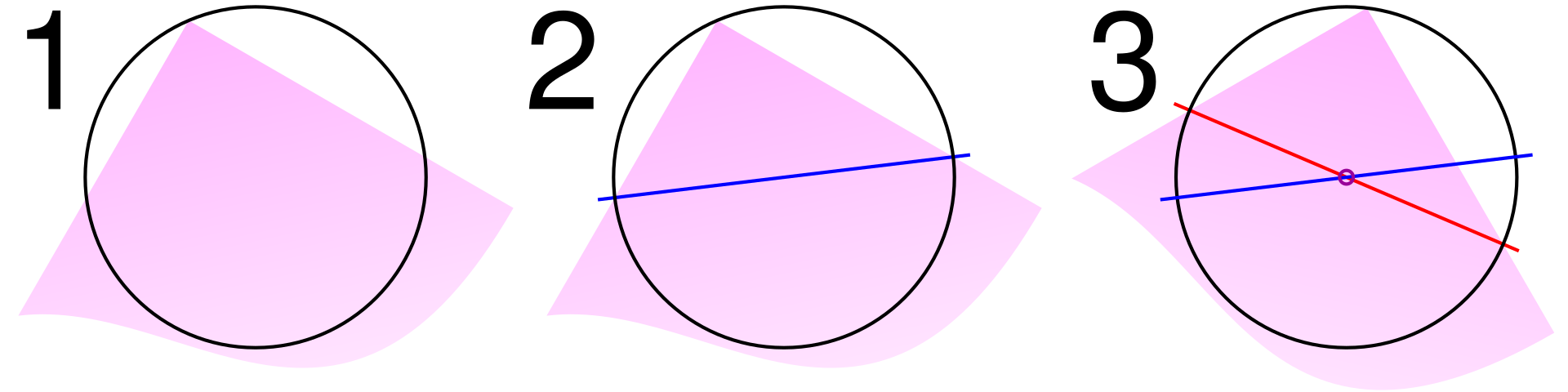 塔勒斯定理还可以用来通过一个具有直角的物体(如三角尺或比圆大且矩形的纸张)找到圆的圆心。[7] 角度被放置在圆的任意一个圆周上(图 1)。两条边与圆周的交点定义了一个直径(图 2)。重复这个过程,使用另一组交点得到另一个直径(图 3)。圆心位于这两个直径的交点处。