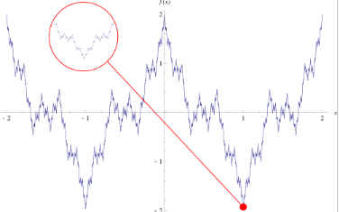 图 1:魏尔斯特拉斯函数在区间 [−2, 2] 上的图像。像其他一些分形一样,该函数表现出自相似性:每次放大(红色圆圈)都与整体图像相似。