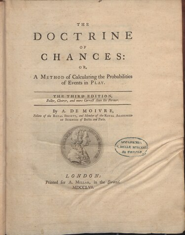 德·莫弗在解析几何和概率论的发展中起到了开创性作用,他在前人的基础上,尤其是克里斯蒂安·惠更斯和伯努利家族成员的工作之上,进一步扩展了这些理论。他撰写了概率论的第二本教科书《机遇论:一种计算游戏中事件概率的方法》。(关于博弈的第一本著作是吉罗拉莫·卡尔达诺在 16 世纪 60 年代撰写的《掷骰之书》,但直到 1663 年才出版。)