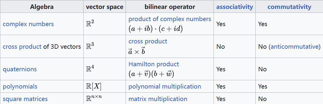 其中,第四个代数是非交换的,其余都是交换的。
