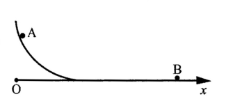 - 在一铅直面内有一个光滑轨道,左边是一个上升的曲线,右边是足够长的水平直线,二者平滑连接,如图所示。现有 A、B 两个质点,B 在水平轨道上静止,A 在曲线部分高 h 处由静止滑下,与 B 发生完全弹性碰撞。碰后仍可返回上升到曲线轨道某处,并再度下滑,已知 A、B 两质点的质量分别为 $m_1$ 和 $m_2$。求至少发生两次碰撞的条件。