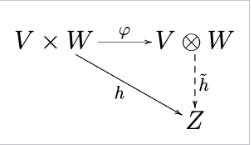 两个向量空间 \( V \) 和 \( W \) 的张量积是一个向量空间,记作 \( V \otimes W \),以及一个双线性映射 \(\otimes : (v, w) \mapsto v \otimes w\) 从 \( V \times W \) 到 \( V \otimes W \),使得,对于每一个双线性映射 \( h: V \times W \to Z \),存在一个唯一的线性映射 \( \tilde{h}: V \otimes W \to Z \),使得 \(h = \tilde{h} \circ \otimes\)(即,对于每个 \( v \in V \) 和 \( w \in W \),有 \( h(v, w) = \tilde{h}(v \otimes w) \))。