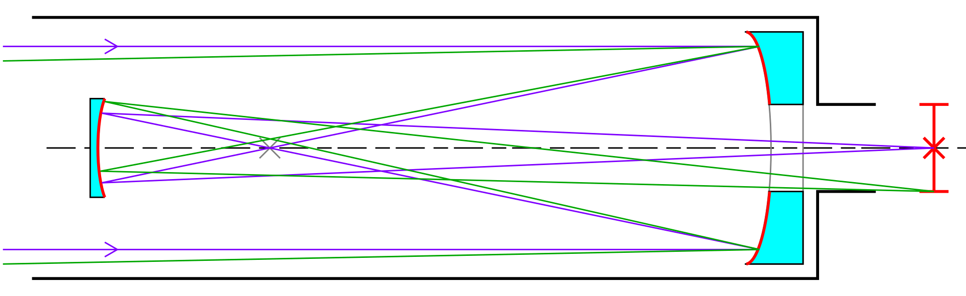在他 1663 年的著作《Optica Promota》中,詹姆斯·格里高利描述了一种反射望远镜,这种设计后来以他的名字命名为 “格里高利望远镜”。格里高利指出,使用抛物面镜的反射望远镜不仅能校正球面像差,还能修正折射望远镜中出现的色差。在他的设计中,他还在抛物面主镜焦点之后安置了一面椭圆曲面的凹面副镜,把成像反射回主镜中央的孔洞,从而使观测者能够方便地观察图像。按照他本人的坦言,他缺乏实际操作技能,而且当时也找不到能够真正制作这种望远镜的光学工匠。\(^\text{[15]}\)