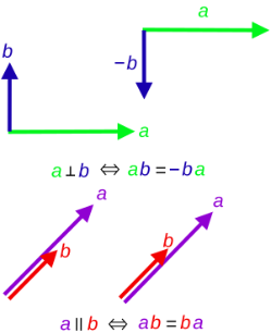 对于向量 $a$ 和 $b$,任意两个向量的几何积可以写成对称部分与反对称部分的和: $$ ab = \tfrac{1}{2}(ab + ba) + \tfrac{1}{2}(ab - ba).~ $$ 因此,我们可以将向量的内积定义为: $$ a \cdot b := g(a, b),~ $$ 这样,对称部分就可以写为: $$ \tfrac{1}{2}(ab + ba) = \tfrac{1}{2}\left((a+b)^{2} - a^{2} - b^{2}\right) = a \cdot b.~ $$ 反过来说,双线性型 $g$ 完全由代数结构决定。反对称部分则是两个向量的外积,即包含在其中的外代数的乘积: $$ a \wedge b := \tfrac{1}{2}(ab - ba) = -(b \wedge a).~ $$ 于是,通过简单相加:$ab = a \cdot b + a \wedge b$ 这就是几何积的非广义(即向量形式)的表达式。
