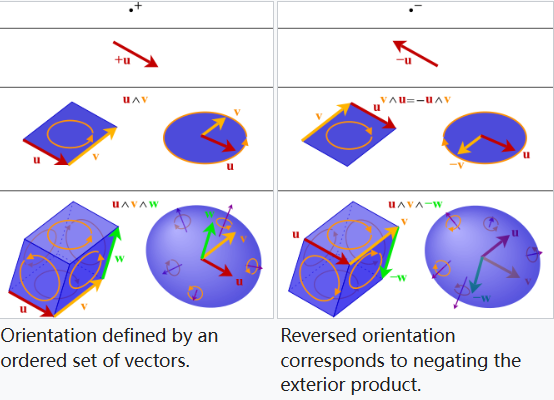 | 名称 | 符号 | 刀刃,例如代数可表示的定向几何对象 | 旋量,例如代数可表示的保持方向的变换 | 备注 |