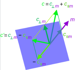 向量 $c$ 关于向量 $m$ 的反射(等价于在与 $m$ 正交的超平面上的反射),实际上就是将 $c$ 在 $m$ 方向上的分量取反。反射后的结果为: $$ c' = -c_{\parallel m} + c_{\perp m} = -(c \cdot m)m^{-1} + (c \wedge m)m^{-1} = (-m \cdot c - m \wedge c)m^{-1} = -m c m^{-1}.~ $$ 当空间维数 $n \geq 4$ 时,这并不是唯一可以视为 “反射” 的一般操作。一般反射可以表示为任意奇数次单轴反射的复合。因此,向量 $a$ 的一般反射 $a'$ 可写为: $$ a \;\mapsto\; a' = - M a M^{-1},~ $$ 其中: $$ M = p q \cdots r, \quad M^{-1} = (p q \cdots r)^{-1} = r^{-1} \cdots q^{-1} p^{-1}.~ $$ 如果定义沿着一个非零向量 $m$ 对向量乘积的反射为:该乘积中的每个向量都沿着同一个 $m$ 进行反射,那么:对于奇数个向量的乘积(例如 $a b c$): $$ (abc)' = a'b'c' = (-mam^{-1})(-mbm^{-1})(-mcm^{-1}) = -ma(m^{-1}m)b(m^{-1}m)cm^{-1} = -mabc m^{-1}.~ $$ 对于偶数个向量的乘积(例如 $a b c d$): $$ (abcd)' = a'b'c'd' = (-mam^{-1})(-mbm^{-1})(-mcm^{-1})(-mdm^{-1}) = m a b c d m^{-1}.~ $$ 由于任意多向量最终都可以用向量表示,任意多向量 $A$ 的一般反射(使用任意反射旋量 $M$)可以写为: $$ A \;\mapsto\; M \alpha(A) M^{-1},~ $$ 其中 $\alpha$ 是一种关于向量空间原点反射的自同构($v \mapsto -v$),并且通过线性扩展作用于整个代数。