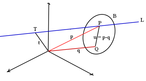 于是有: $$ B \wedge (p - q) = 0~ $$ $$ B \wedge (t + \alpha v - q) = 0~ $$ 解得: $$ \alpha = \frac{B \wedge (q - t)}{B \wedge v},~ $$ 进而得到直线与平面的交点: $$ p = t + \left(\frac{B \wedge (q - t)}{B \wedge v}\right)v.~ $$