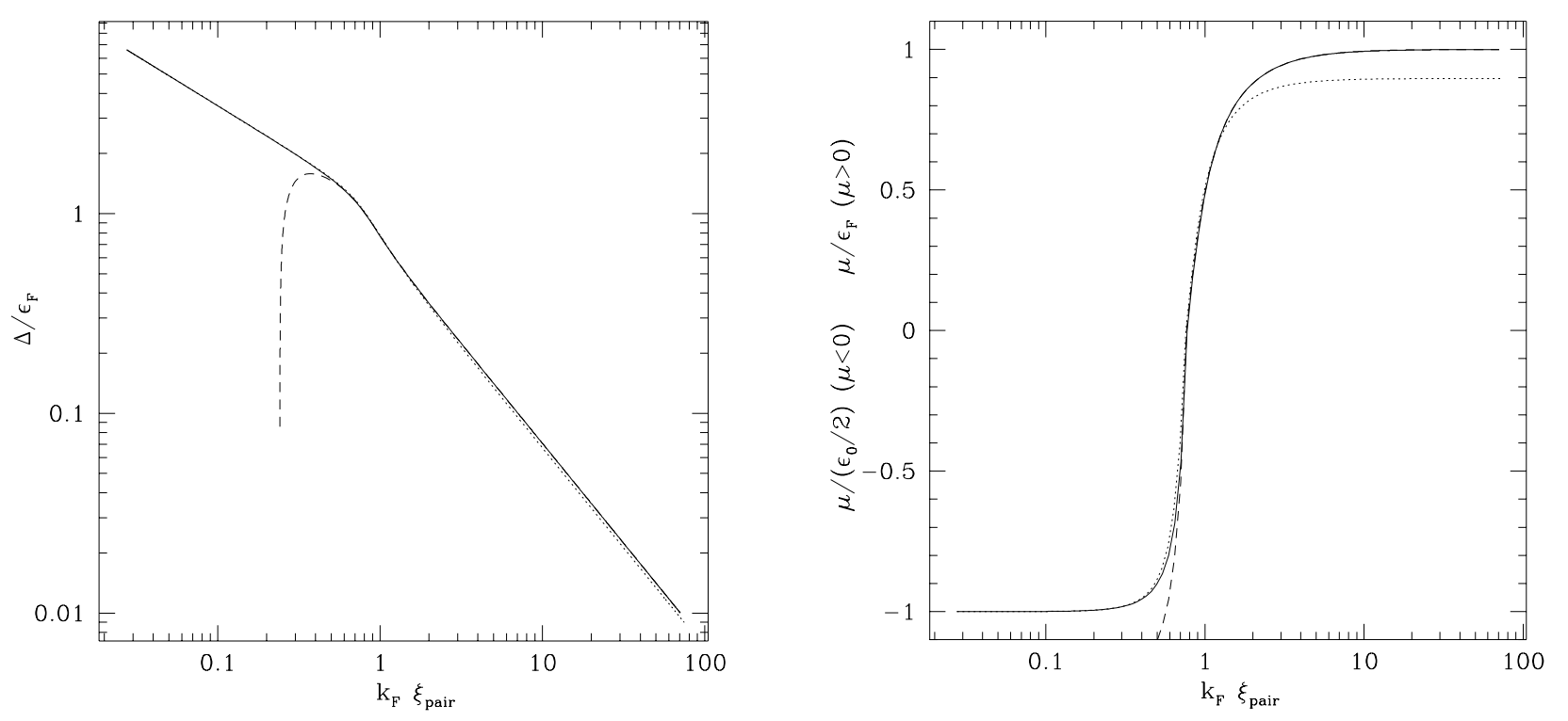 Fig. 1:左:$\Delta/E_F$ vs $k_F\xi_{\text{pair}}$,右:$\mu/E_F(\mu > 0), \mu/(\epsilon_0/2)(\mu < 0)$,区分两种情况是因为在 Bose 情况下没有费米能的定义,$\epsilon_0\equiv1/(ma_s^2)$