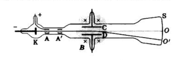 玻璃管内抽成真空,在阳极 $A$ 与阴极 $K$ 之间维持数千伏特的电压,靠管内残存的气体的离子在阴极引起的二次发射产生电子流.阳极 $A$ 和第二个金属屏 $A'$ 中央各有一个小孔,$K$、$A$ 之间被加速了电子流,只有很窄一束能够通过两孔.玻璃管的中部 $C$、$D$ 为电容板的两极板,在其间可产生一竖直方向的电场.图中阴影部分,是由管外的电磁铁产生一方向垂直纸面的磁场.适当的调节电场和磁场的强度,可使它们作用在电子上的力达到平衡,即: